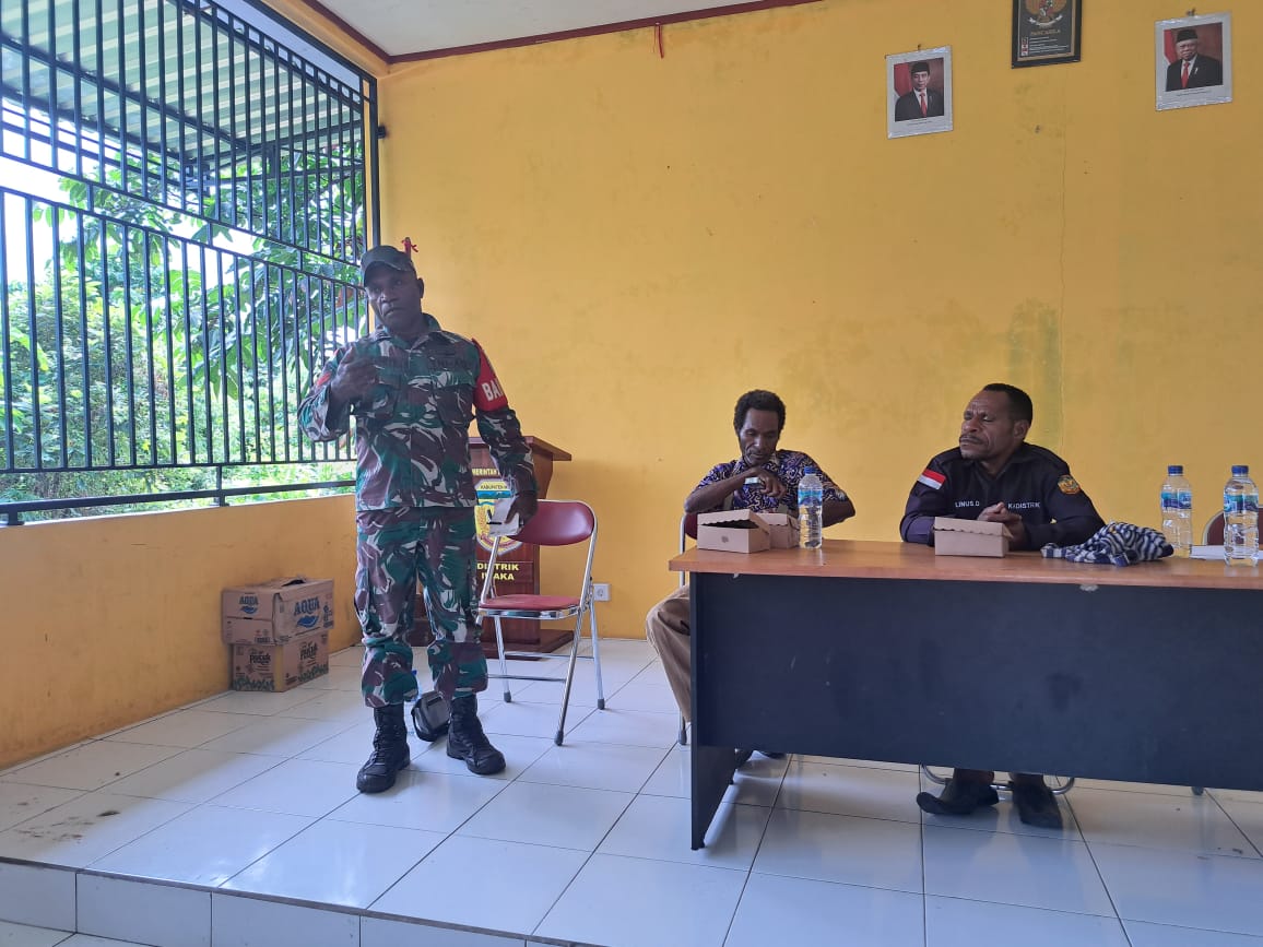REAKSIMEDIA.COM | Timika – Salah satu bentuk tanggung jawab menjadi seorang aparat teritorial adalah harus mampu menyelesaikan setiap permasalahan yang ada di wilayah binaan dengan bersinergi bersama Bhabinkamtibmas dan aparat setempat. Hal inilah yang dilakukan oleh Babinsa Koramil 1710-03/Kuala Kencana Koptu Alfaris Kumiyu dalam membantu mediasi penyelesaian permasalahan warga di Kp. Iwaka, bertempat di Aula Kantor Distrik Iwaka, Kab. Mimika, Senin (12/06/2023).
