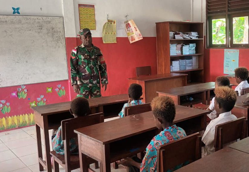 REAKSIMEDIA.COM | Timika – Dalam rangka menanamkan rasa cinta tanah air kepada generasi penerus guna meningkatkan wawasan, khususnya keikutsertaan dalam menjaga keutuhan Negara Kesatuan Republik Indonesia (NKRI) sejak dini, Bintara Pembina Desa (Babinsa) Koramil 1710-03/Kuala Kencana Koptu Alfaris Kumiyu berkoordinasi dengan guru untuk memberikan pembekalan materi Wawasan Kebangsaan kepada siswa-siswi SD YPPK ST. Yakobus di Kp. Iwaka, Distrik Iwaka, Kab. Mimika, Sabtu (20/01/2024).