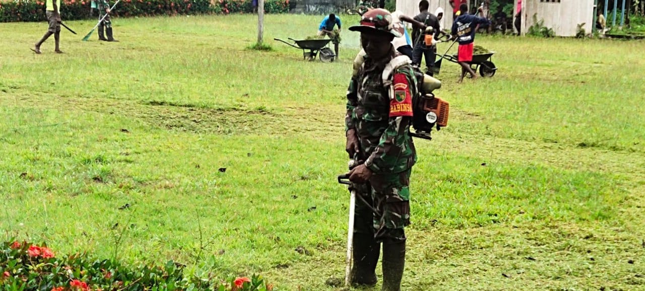 REAKSIMEDIA.COM | Timika — Babinsa Posramil Jita, Koramil 1710-06/Agimuga bersama warga masyarakat melaksanakan kerja bakti pembersihan lingkungan Gereja Katholik ST. Stefanus Kp. Sempan Timur Distrik Jita, Kab. Mimika, Kamis (9/02/2023).