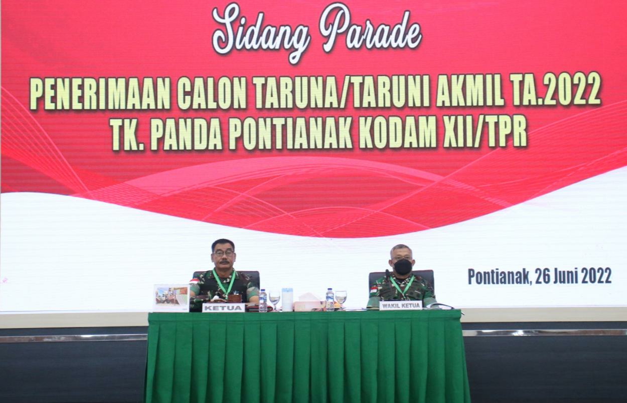 REAKSIMEDIA.COM | Kubu Raya – Minggu (26/6/22), Sidang Parade Penerimaan Calon Taruna/Taruni Akmil TA 2022 Tingkat Panda Pontianak berlangsung ketat dan transparan. Sidang Parade dilaksanakan hari ini dipimpin langsung oleh Pangdam XII/Tanjungpura, Mayjen TNI Sulaiman Agusto, S.I.P., M.M., di Aula Sudirman, Makodam XII/Tpr.