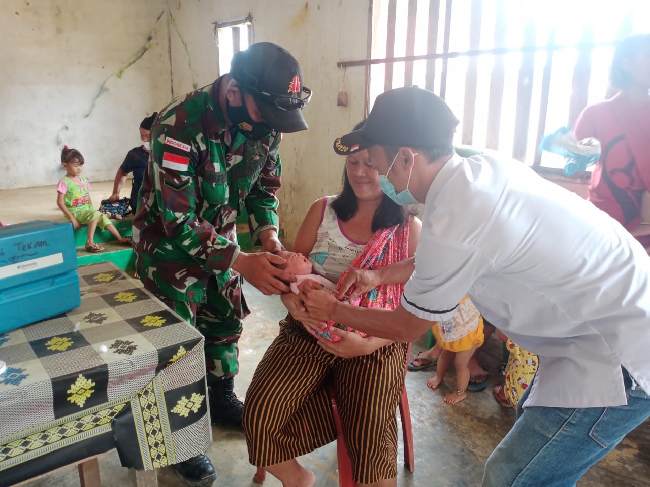 REAKSIMEDIA.COM | Sanggau – Anggota Satgas Pamtas RI-Malaysia Yonif 144/JY membantu tenaga medis Puskesmas melaksanakan Posyandu di Balai dusun Sei Beruang desa Sei Tekam, Kecamatan Sekayam, Kabupaten Sanggau, Kalbar.