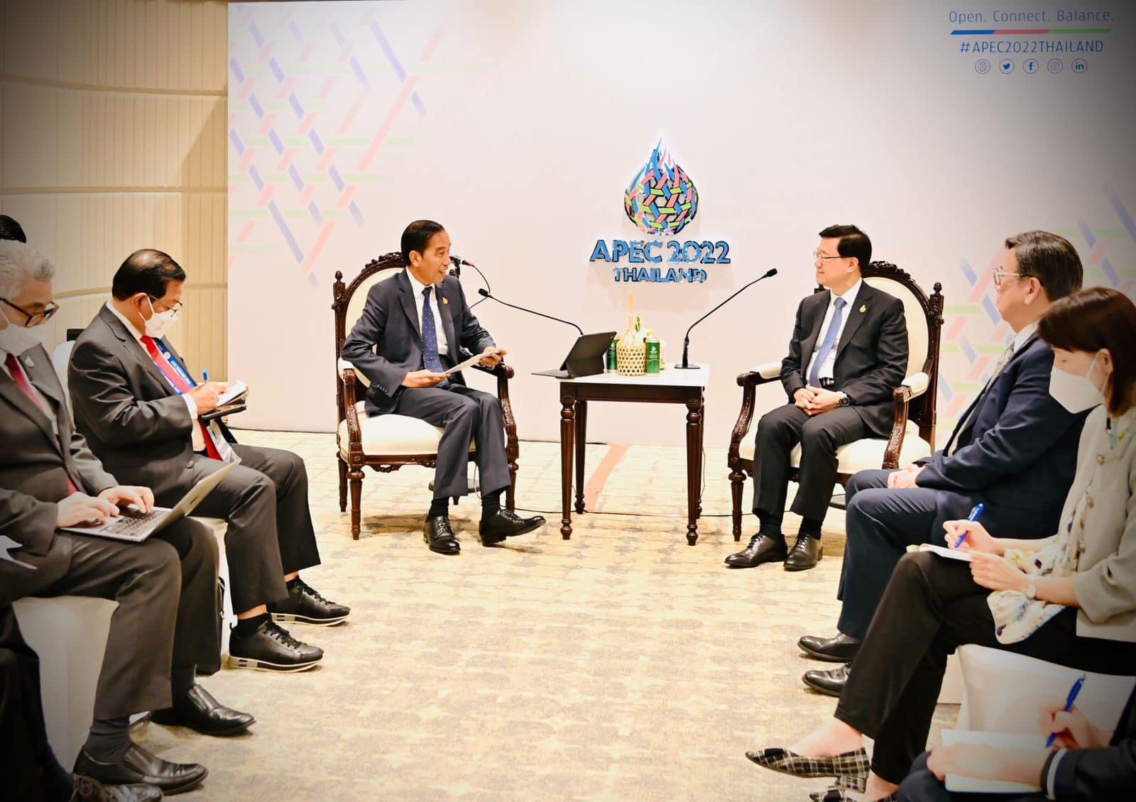 REAKSIMEDIA.COM | Bangkok – Presiden Joko Widodo melakukan pertemuan dengan Chief Executive Daerah Adminitrasi Khusus Hong Kong John Lee di sela pertemuan pemimpin ekonomi APEC di Queen Sirikit National Convention Center, Bangkok, Jumat, 18 November 2022.