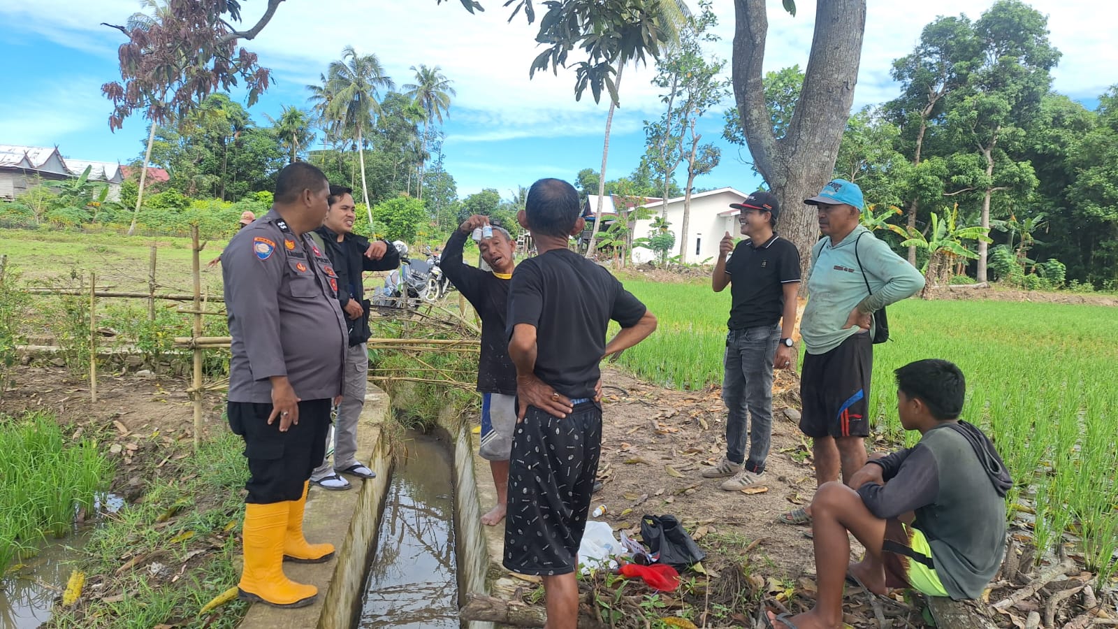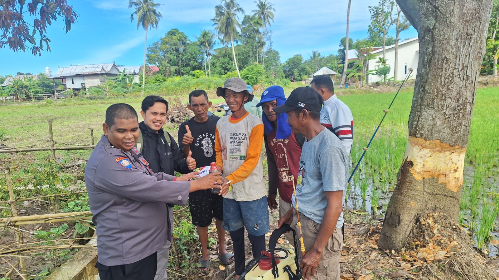 REAKSIMEDIA.COM | Pinrang – Dalam rangka mendukung Ketahanan Pangan Nasional, Bhabinkamtibmas Desa Siwolong polong, Aiptu H. Hasanuddin, S.Sos., bersama Distributor dari perusahaan Racun dari SGI ( SINAR GENERAL INDUSTRI) Agus sambang/ DDS dengan Ketua Kelompok Tani Dara Kapa 3 dan Kelompok Tani Mattuju lalang 4 bersama anggotanya dan menyerahkan bantuan insektisida berupa racun penggerek batang dan racun wereng walang sangit, dan sekaligus diadakan testimoni penyemprotan terhadap hama yang menyerang tanaman padi, didaerah persawahan dusun Kapa desa Siwolong polong kecamatan Mattiro Sompe Kabupaten Pinrang pada hari Jum’at, 28 februari 2025