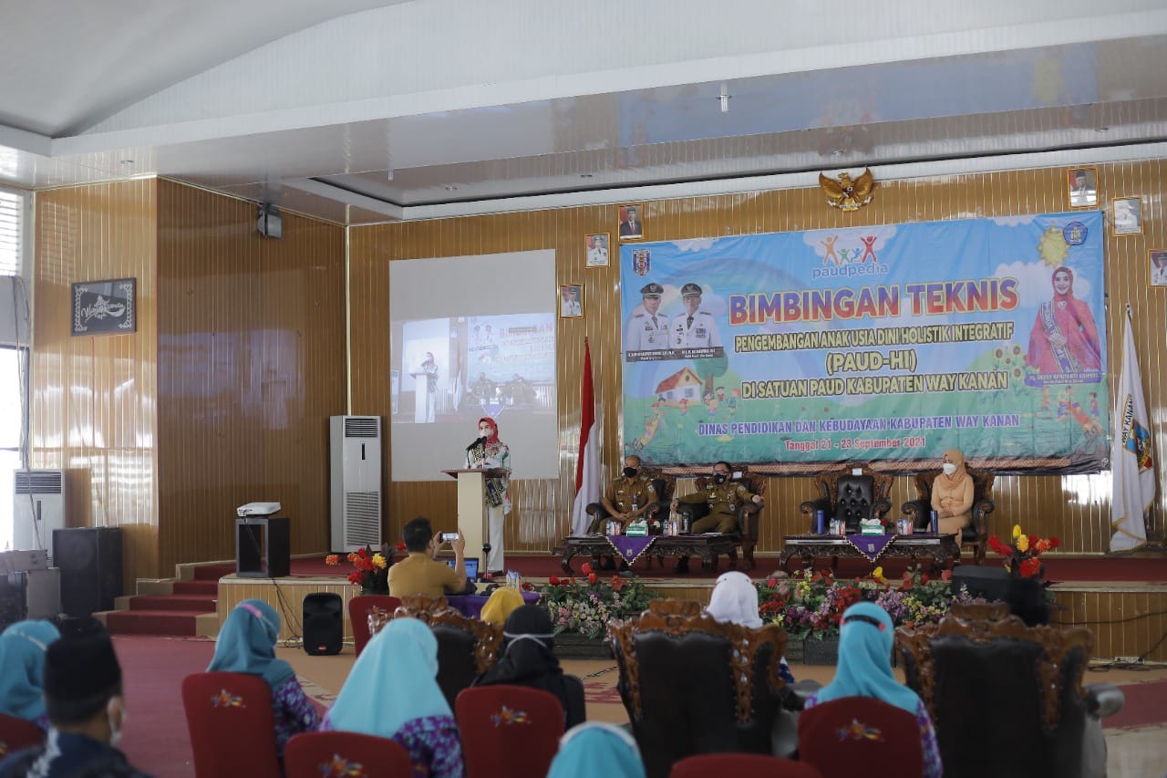 REAKSIMEDIA.COM | Way Kanan, Lampung – Bunda PAUD Kabupaten Way Kanan, bunda Hj. Dessy Afriyanti Adipati membuka Bimtek untuk Peningkatan Kapasitas Penyelenggaraan PAUD-HI Kepada satuan PAUD Kabupaten Way Kanan.