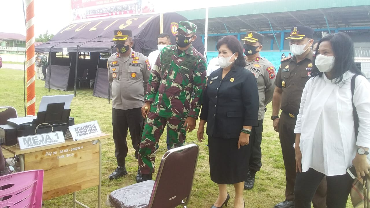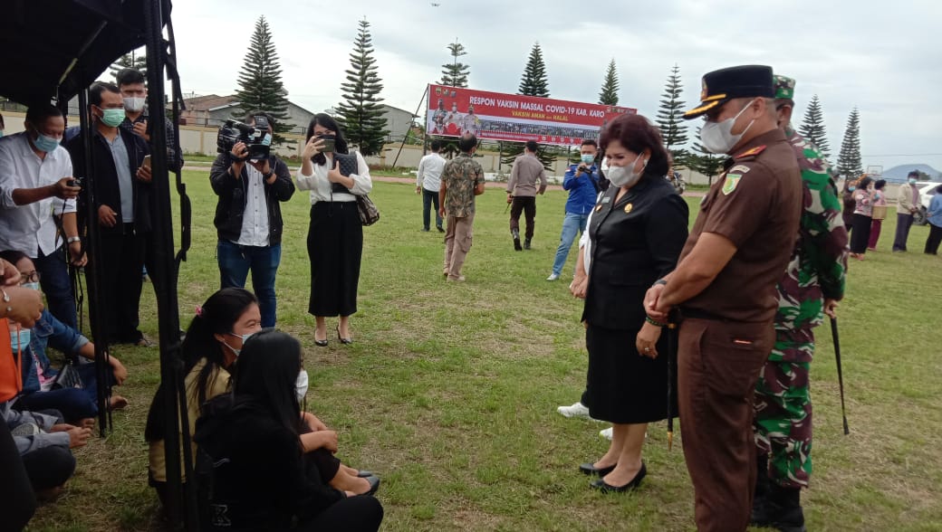 Bupati Karo Cory S Sebayang didampingi Kepala Dinas Kesehatan drg Irna S Br Milala sampai di lapangan Samura pukul 9.30 Wib dan langsung melakukan peninjauan dan pengecekan Vaksinasi.