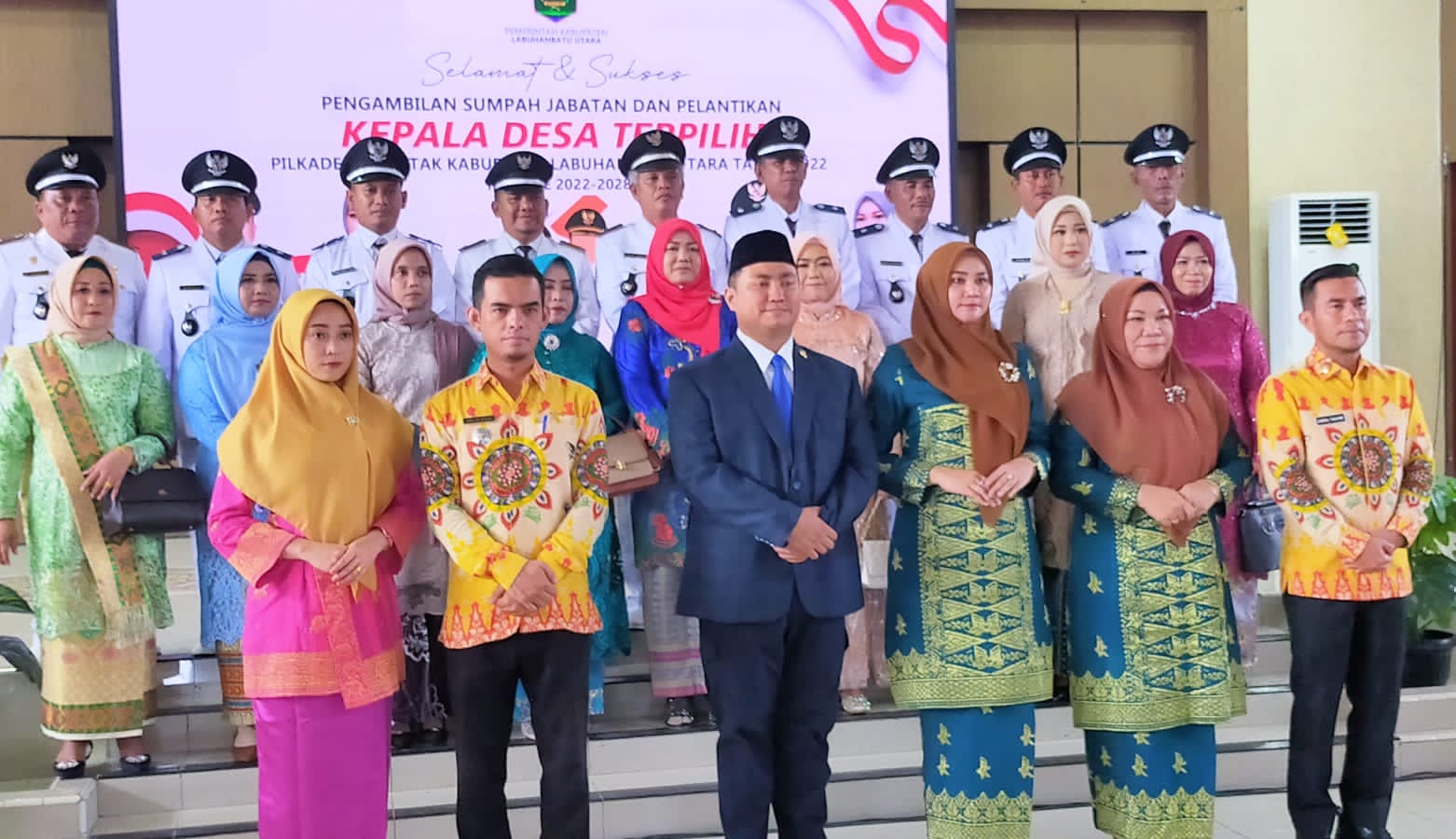 REAKSIMEDIA.COM | Labuhan Batu Utara – Bupati Labuhan Batu Utara Hendriyanto Sitorus, SE, melakukan Pengambilan Sumpah Jabatan dan Pelantikan 59 Kepala Desa terpilih untuk periodeTahun 2022 – 2028 di Aula Ahmad Dewi Syukur Kantor Bupati Labuhan Batu Utara, Kamis (30/06).