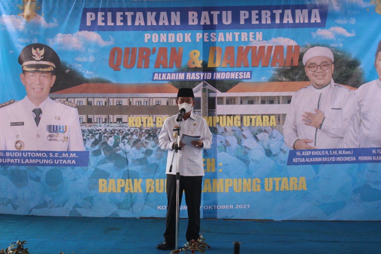 “Mudah-mudahan, melalui momentum peletakan batu pertama pembangunan Pondok Pesantren Alkarim Rasyid Indonesia kita semua senantiasa diberikan kesehatan dan perlindungan dari Allah SWT, serta semoga pandemi Covid-19 ini segera berakhir sehingga Kabupaten Lampung Utara dapat senantiasa dalam kondisi yang aman, agamis, maju dan sejahtera,” tandas Bupati.