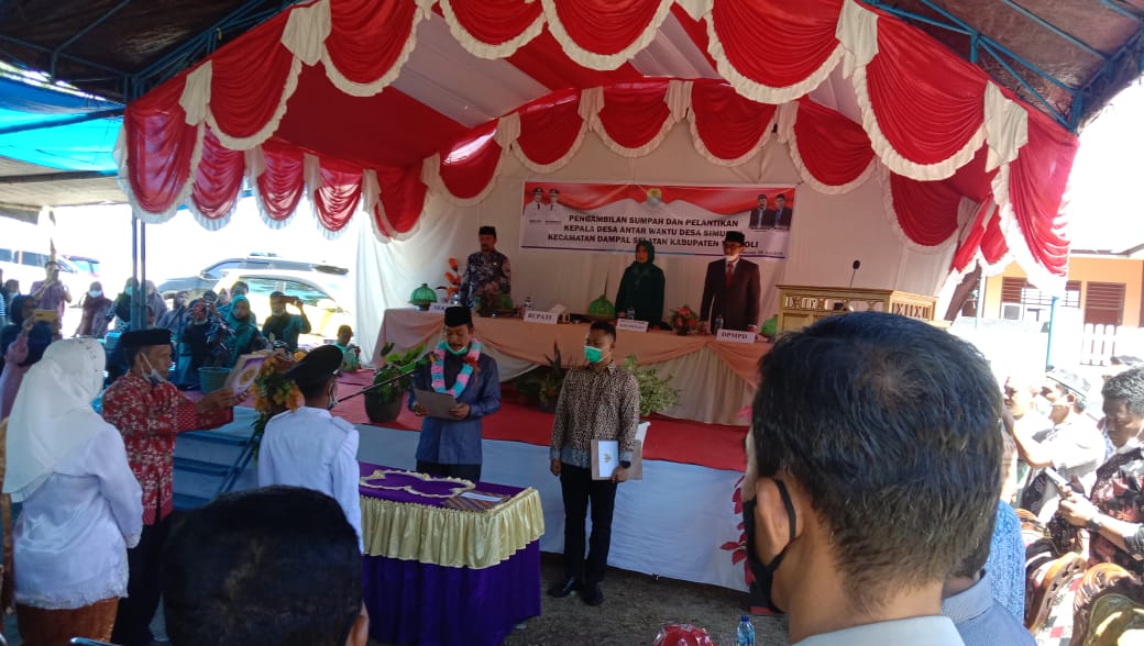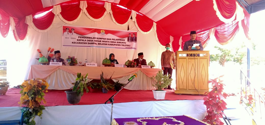Acara pelantikan dengan penerapan protokol kesehatan yang ketat, digelar di halaman Kantor Desa Simuntu itu dihadiri oleh Ketua Tim Penggerak PKK Kabupaten Tolitoli Sriyanti Amran Hi Yahya Dg. Parebba, Sekretaris Daerah Moh. Asrul Bantilan, Asisten Sekda bidang Pemerintahan Anhar Dg. Mallawa, Kepala Dinas Pemberdayaan Masyarakat dan Desa Moh. Zikron Lamaming, Camat Dampal Selatan Salman Hi. Yahya, Unsur Forum Koordinasi Pimpinan Kecamatan, para Kepala Desa dan pengurus BPD se Kecamatan Dampal Selatan.