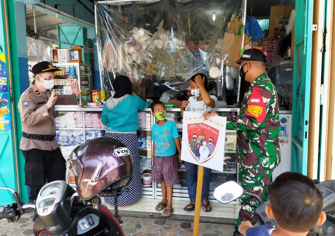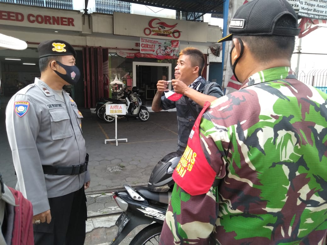 “Anggota Danramil 09/Grogol bersama Polsek Grogol mendisiplinkan warga dengan cara memberikan masker kepada masyarakat yang tidak memakai masker saat melakukan aktivitas di luar rumah,” kata Danramil 09/Grogol Kapten Czi Hartono.