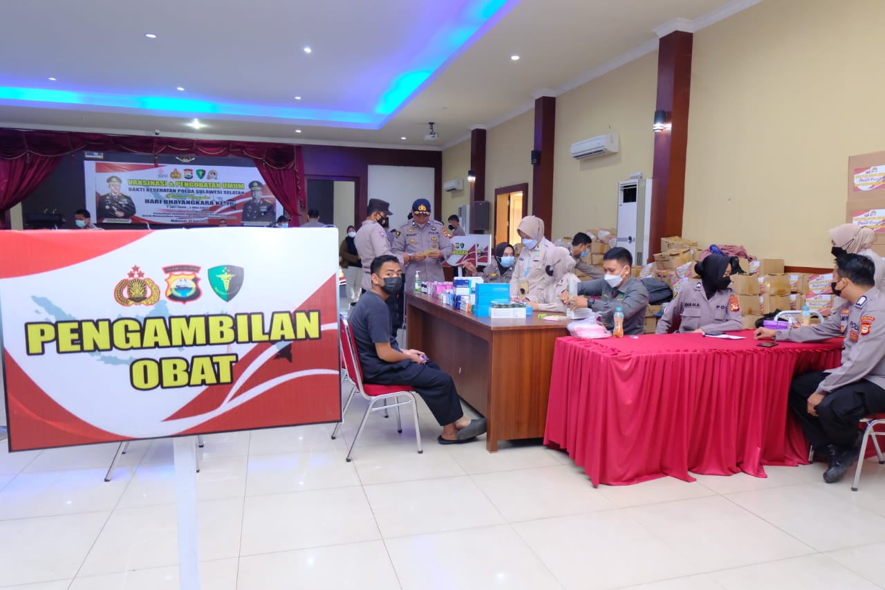 Dalam rangka Hari Bhayangkara Ke-76 Personil Polda Sulsel Menggelar Kegiatan Vaksinasi dan Pengobatan Gratis yang disambut antusias oleh masyarakat umum dan sekitarnya yang datang untuk melakukan pemeriksaan.
