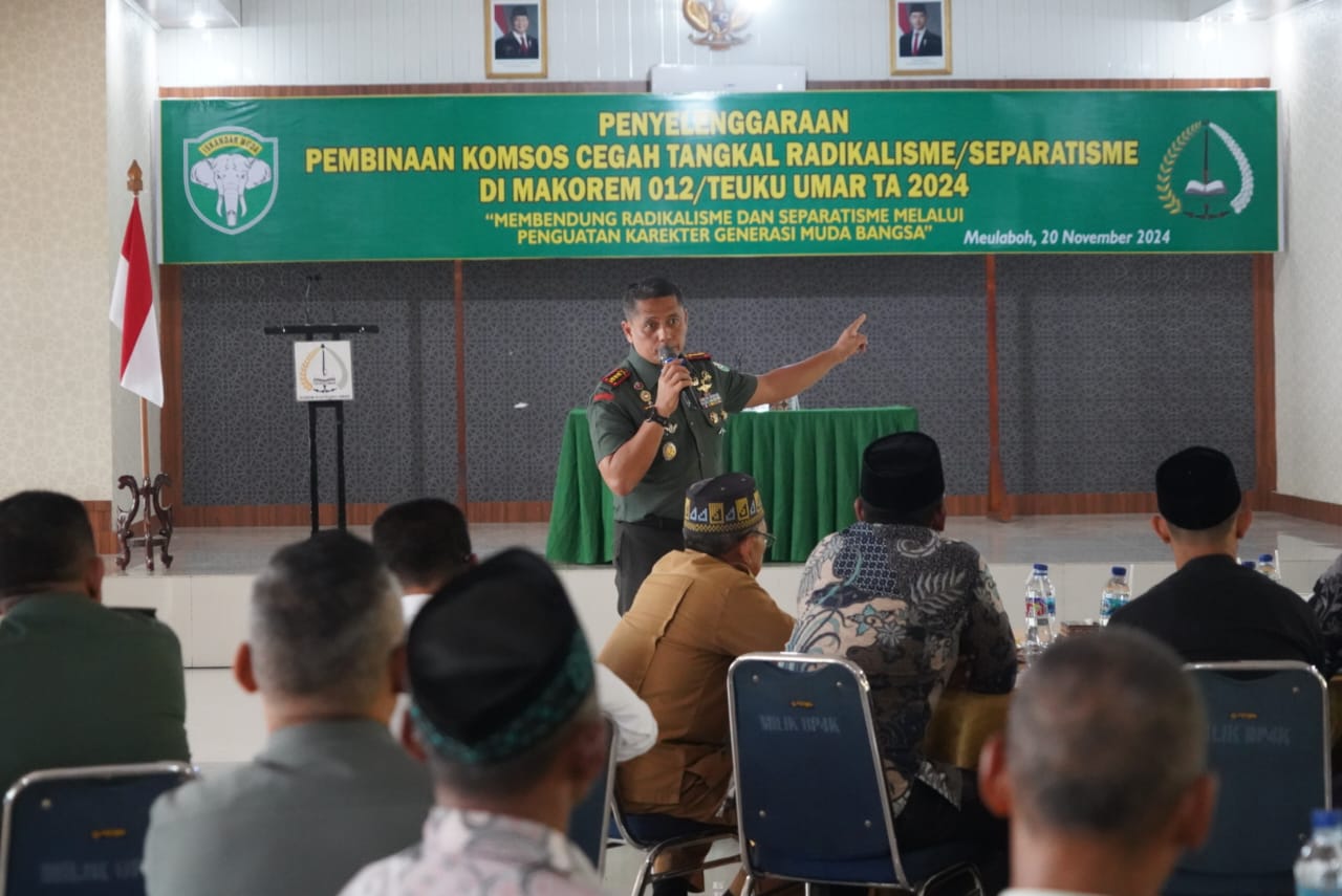 REAKSIMEDIA.COM | Meulaboh – Korem 012/Teuku Umar menggelar Komunikasi Sosial (Komsos) bertema “Membendung Radikalisme dan Separatisme Melalui Penguatan Karakter Generasi Muda Bangsa” di Aula Bhakti Gara Makorem, Rabu (20/11/2024). Kegiatan ini bertujuan mempererat silaturahmi antara masyarakat dengan TNI AD, khususnya Korem 012/TU, sekaligus mendukung tugas pokok sebagai Satuan Komando Kewilayahan (Satkowil).