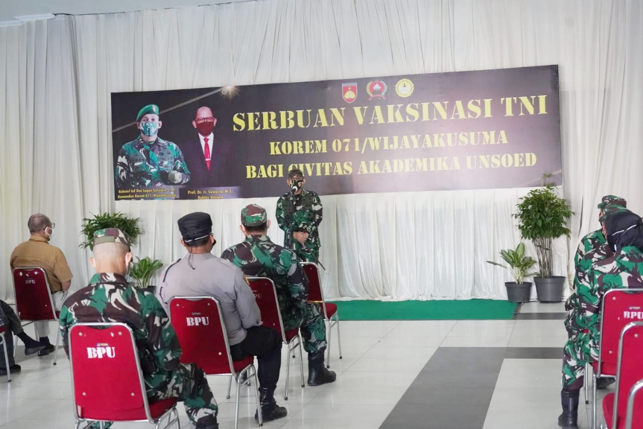 Sementara itu, Rektor Universitas Jenderal Sudirman Prof. Dr. Suwarto, M.S., menyampaikan apresiasinya kepada Korem 071/Wk atas terselenggaranya kegiatan vaksinasi ini bagi civitas akademika Unsoed Purwokerto. Ia berharap, dengan vaksinasi ini, pandemi Covid-19 cepat berakhir.
