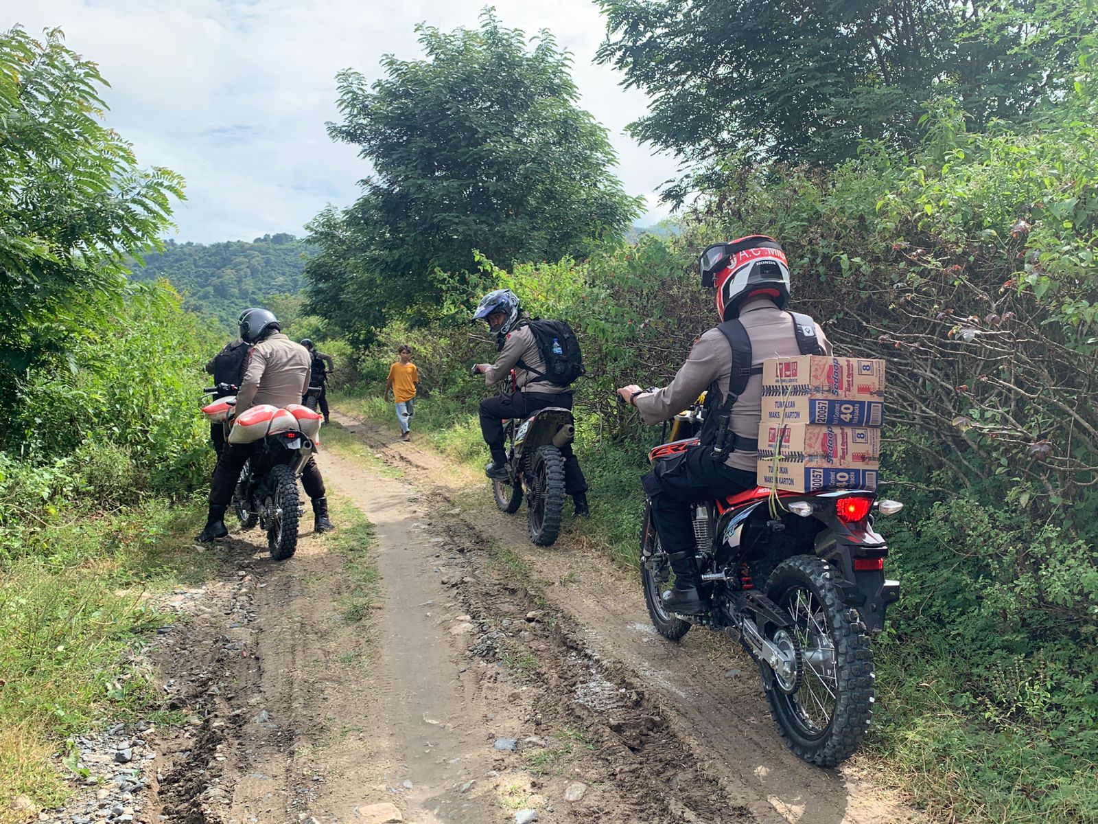 Dimana untuk mencapai lokasi tersebut, para personil Brimob ibu harus menempuh jarak 12 Km dengan kondisi jalan licin dan curam.