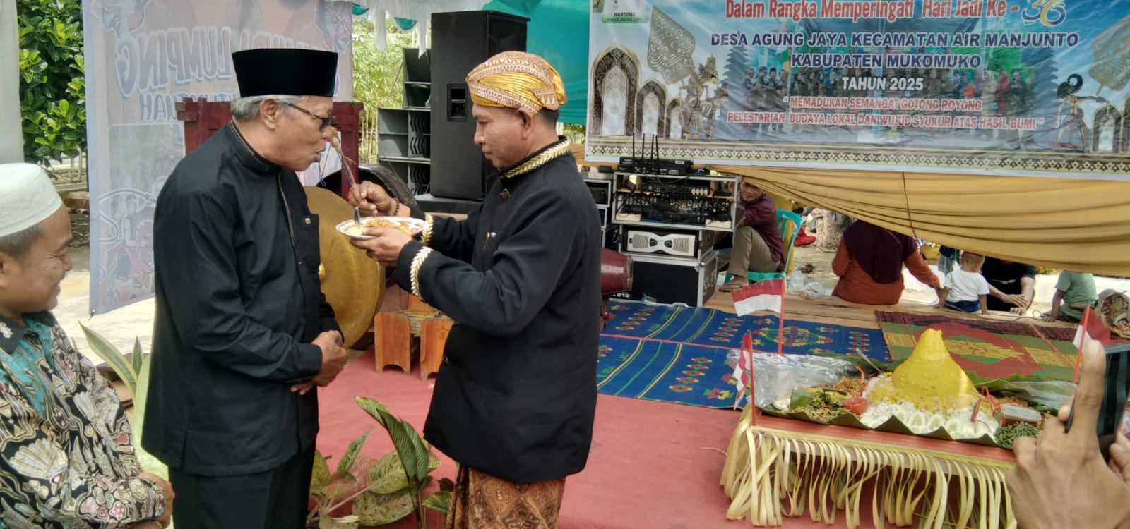 REAKSIMEDIA.COM | Mukomuko – Pemerintah Desa Agung Jaya menggelar Tradisi Bersih Desa/Sedekah Bumi dalam rangka memperingati Hari Jadi Desa Agung Jaya ke 36 tahun 2025, acara yang digelar di halaman Kantor Desa Agung Jaya Kecamatan Air Manjuto Kabupaten Mukomuko mengambil tema “Memadukan Semangat Gotong Royong, Pelestarian Budaya Lokal dan Wujud Syukur Atas Hasil Bumi” turut dihadiri Anggota DPRD Provinsi Bengkulu Novri Ardiantasari SE, Camat Air Manjunto Dr M Fadly SSTP Msi, Kakan Kemenag Mukomuko Widodo SHi, Ketua MUI Mukomuko, Tokoh Masyarakat, Tokoh Adat, Babinsa dan Bhabinkamtibmas, Kades dan Perangkatnya, Ketua BPD dan anggota, warga dan berbagai elemen masyarakat Desa Agung Jaya, Minggu (18/5/25).