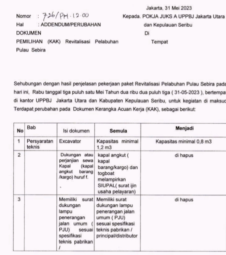 Ditambah lagi, Addendum/Perubahan pada Dokumen Pemilihan (KAK) Revitalisasi Pelabuhan Pulau Seribu yang ditujukan kepada Pokja JUKS A UPPBJ Jakarta Utara dan Kepulauan Seribu. Pada tanggal, 31 Mei 2023, No: 726/PH.12.00, terkait penghapusan SIUPAL (Surat ijin usaha pelayaran) pada Addendum, patut di pertanyakan. Apa urgensinya dilakukan Addendum Perubahan ?” ketusnya dengan geram.