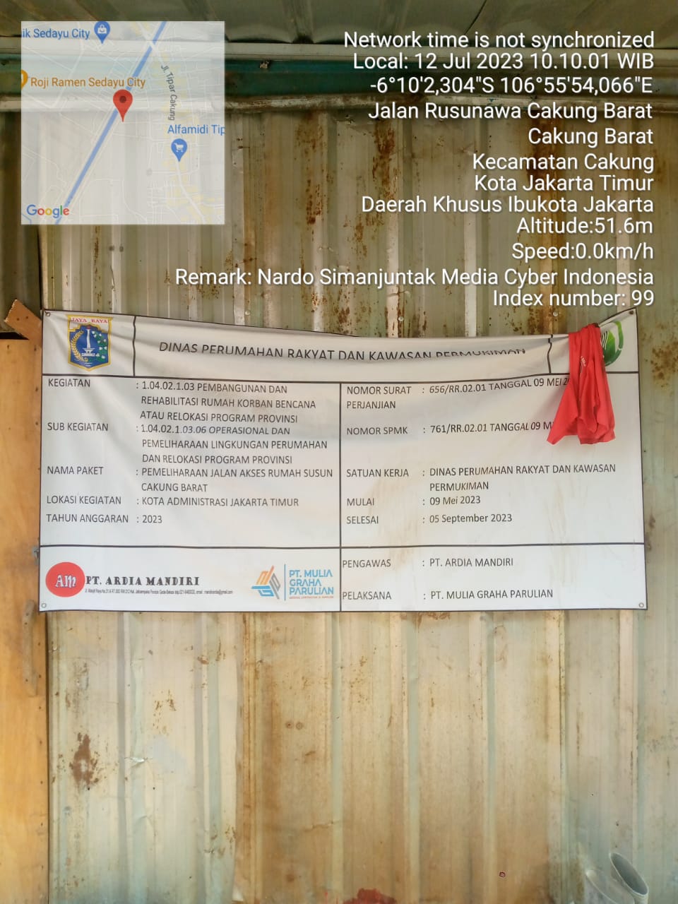 Nama paket pemeliharaan jalan akses rumah susun Cakung Barat, lokasi kegiatan kota administrasi Jakarta Timur.