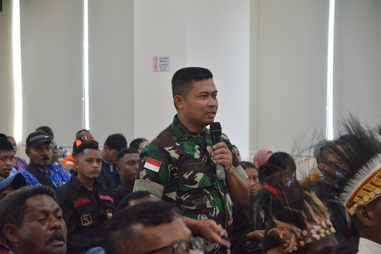 Kegiatan pun dilanjutkan dengan pemaparan dari Ibu Alfasiah (Sekertaris Badan Kesbangpol Mimika) dengan judul Peran Komponen Masyarakat Dalam Mencegah Konflik Sosial, kemudian dilanjutkan dengan pemaparan dari Kolonel Inf Totok Sutriono (Pamen Denmabesad) yang sama-sama menggarisbawahi tentang bahaya konflik sosial di masyarakat.