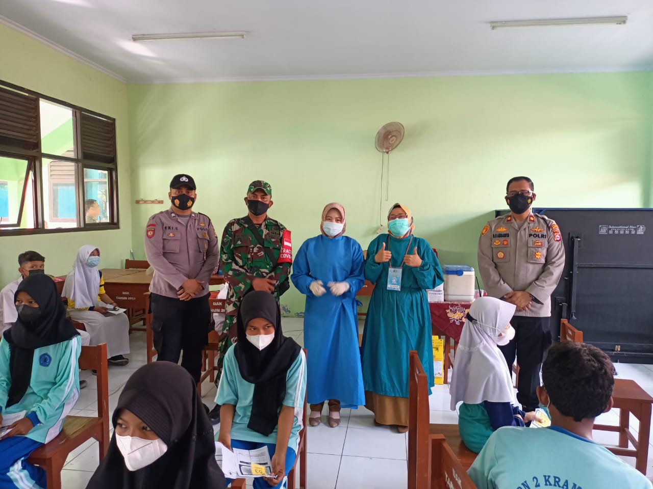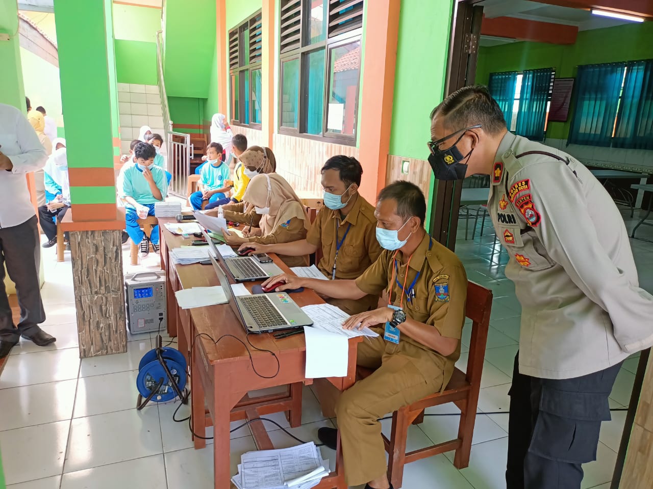 RRAKSIMEDIA.COM | Serang Kota – Gebyar Vaksinasi Covid -19 Anak Sekolah, Polsek Kramatwatu Polres Serang Kota Polda Banten laksanakan pengamanan dan pengawasan protokol kesehatan di Gedung SMPN 2 Kramatwatu Desa Tonjong Kecamatab Kramatwatu Kabupaten Serang. Senin (30/8/2021).