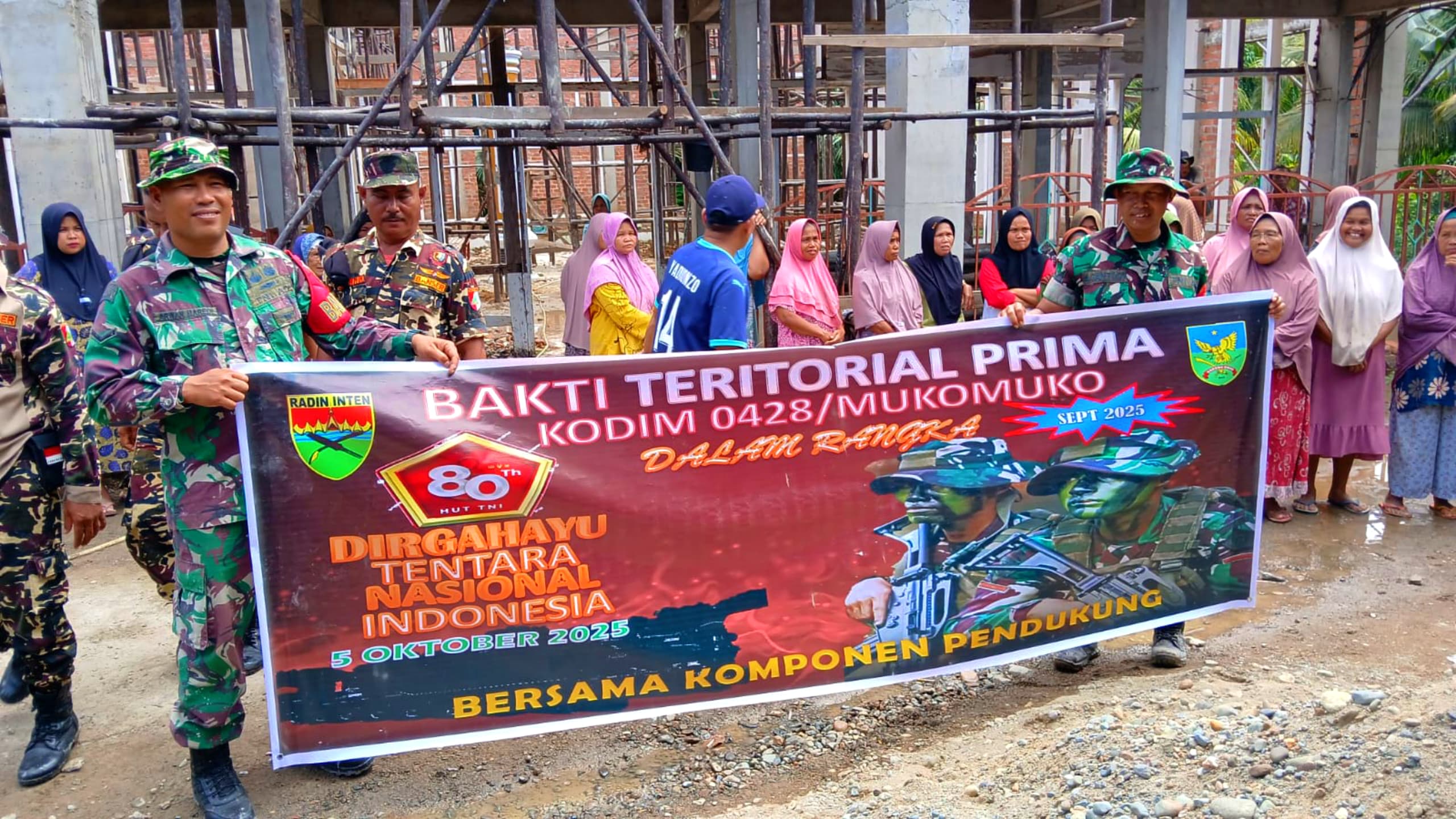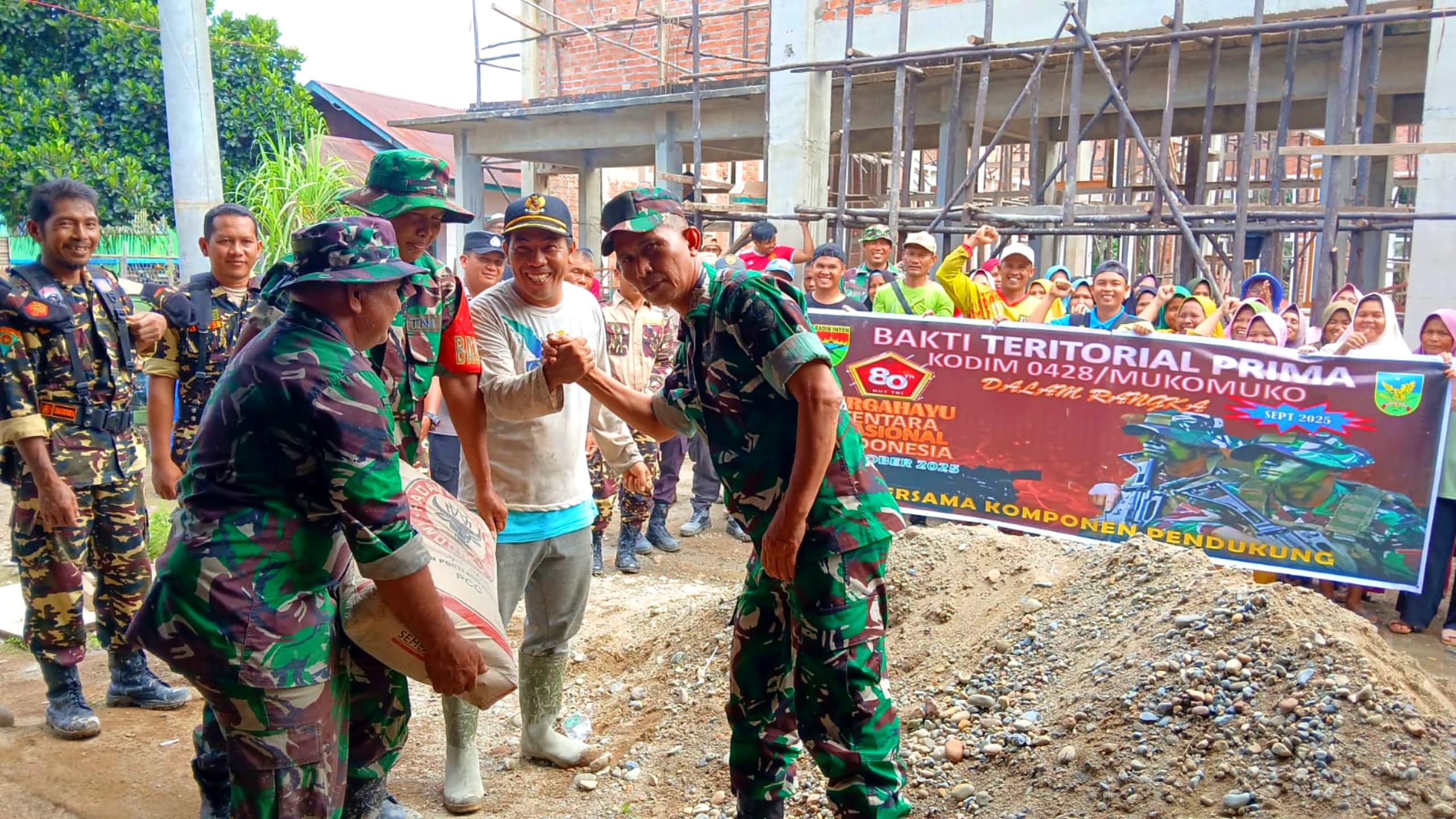 Dalam kegiatan ini, Komandan Kodim 0428/Mukomuko, Letkol Inf Yokki Firmansyah menyampaikan, “bahwa Kegiatan Bakti Teritorial Prima tsb adalah untuk memperingati ke 80 HUT TNI tahun 2025 dimana TNI bersama masyarakat, bersama sama bergotong royong tuk pembangunan Masjid Nurul Iman.