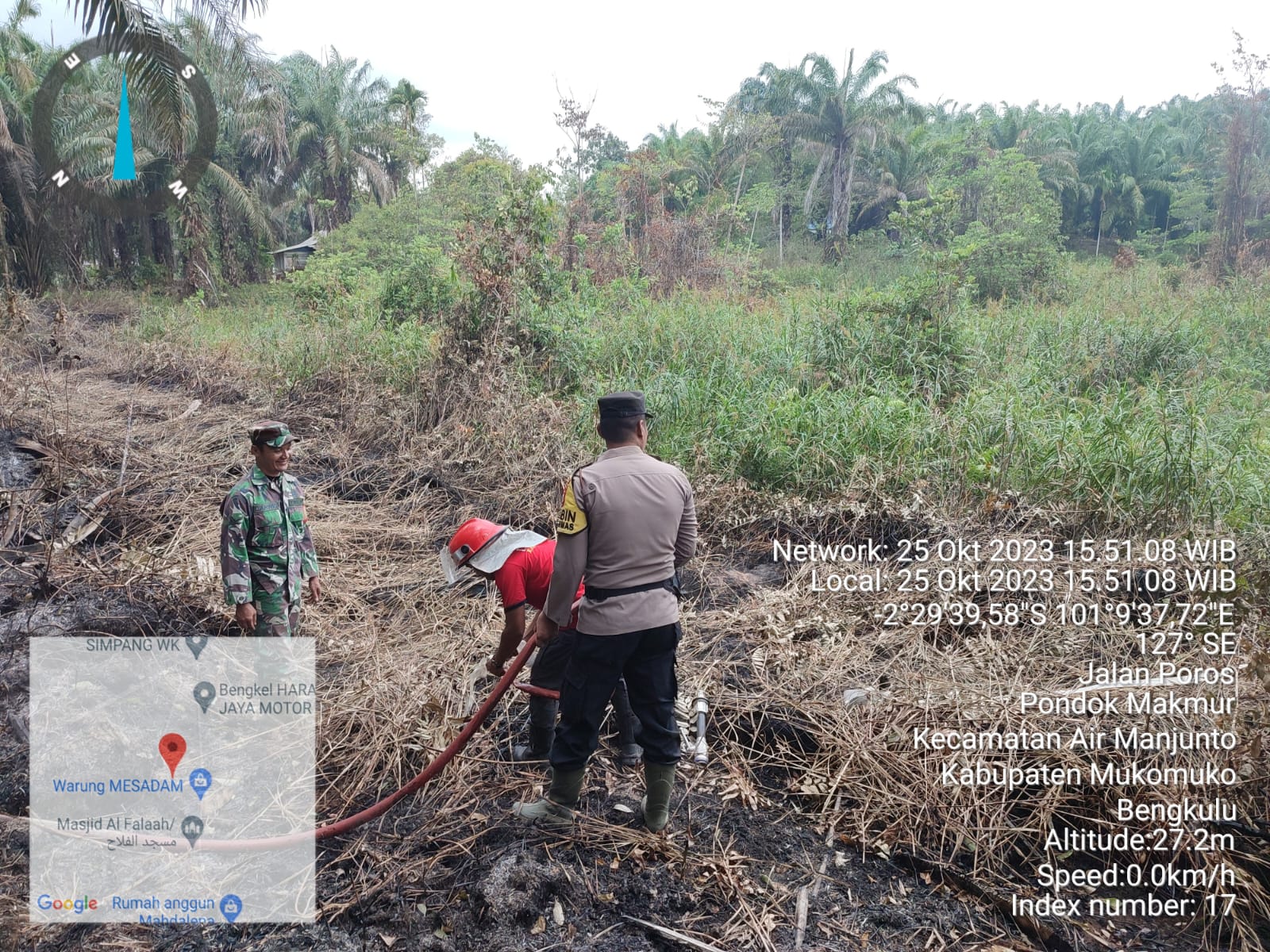 REAKSIMEDIA.COM | Mukomuko – Camat Air Manjuto Sugiyanto Spd bersama Bhabinkamtibmas Bripka Bian R SH dan Babinsa Serda Darwis lakukan antisipasi meluasnya kebakaran hutan dan lahan (Karhutlah) akibat adanya titik api kebakaran lahan di Jalan Poros Pondok Makmur Desa Agung Jaya Kecamatan Air Manjuto Mukomuko, Rabu (25/10/23).