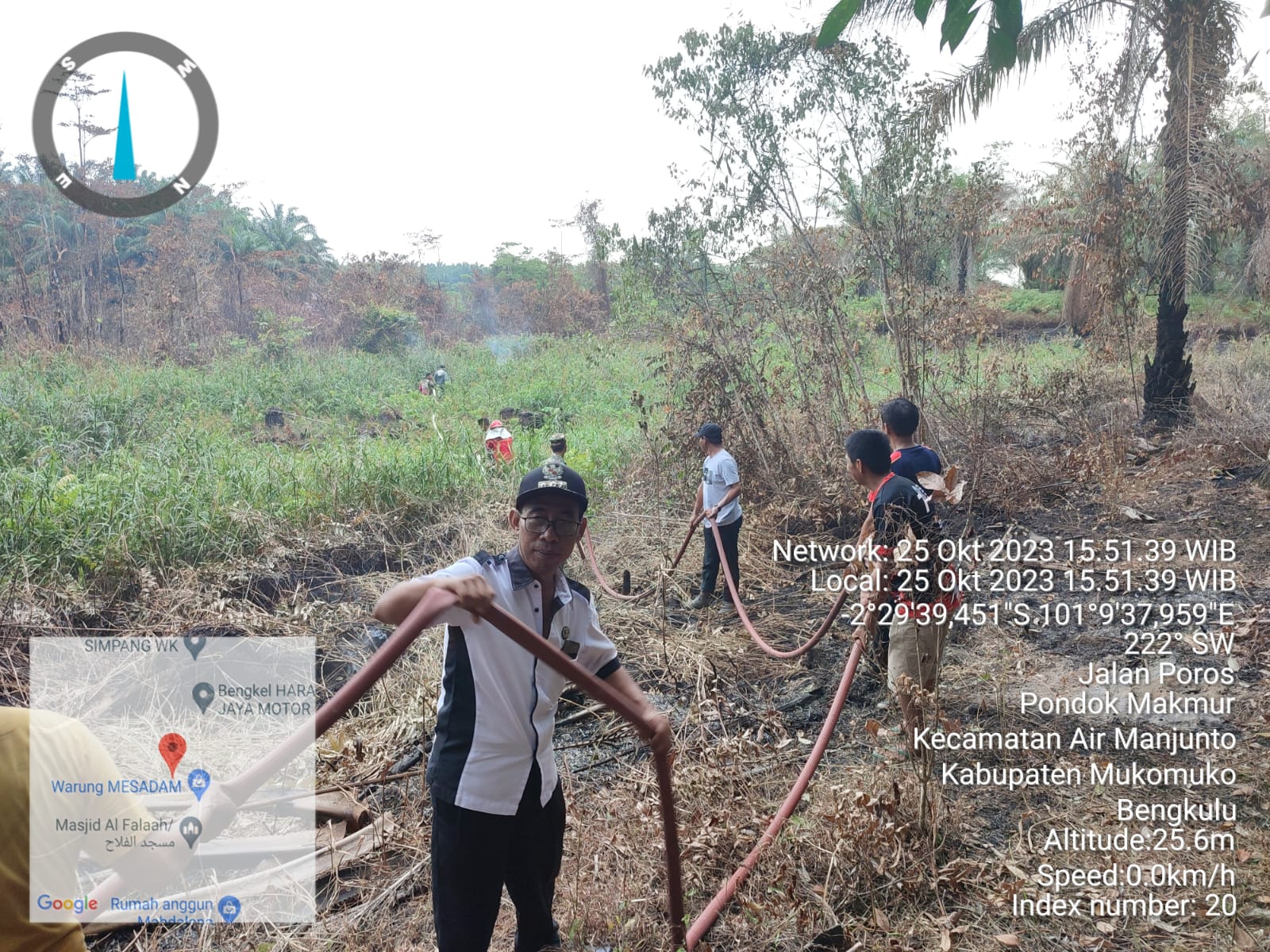 “Bersama Babinsa, Pemdes Agung Jaya dan Camat Air Manjuto dibantu warga setempat dan petugas Damkar segera memadamkan api dengan menggunakan mobil Damkar dari Kabupaten Mukomuko agar titik api tidak meluas” terang Bripka Bian.