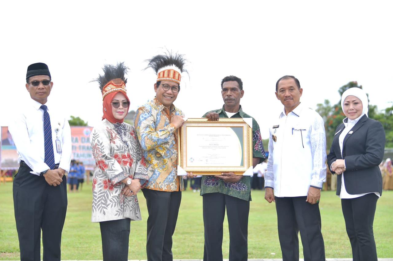 Piagam penghargaan diserahkan kepada Darius Nenop, sebagai transmigran penduduk terbaik di lokasi Muting SP XII Kabupaten Merauke.