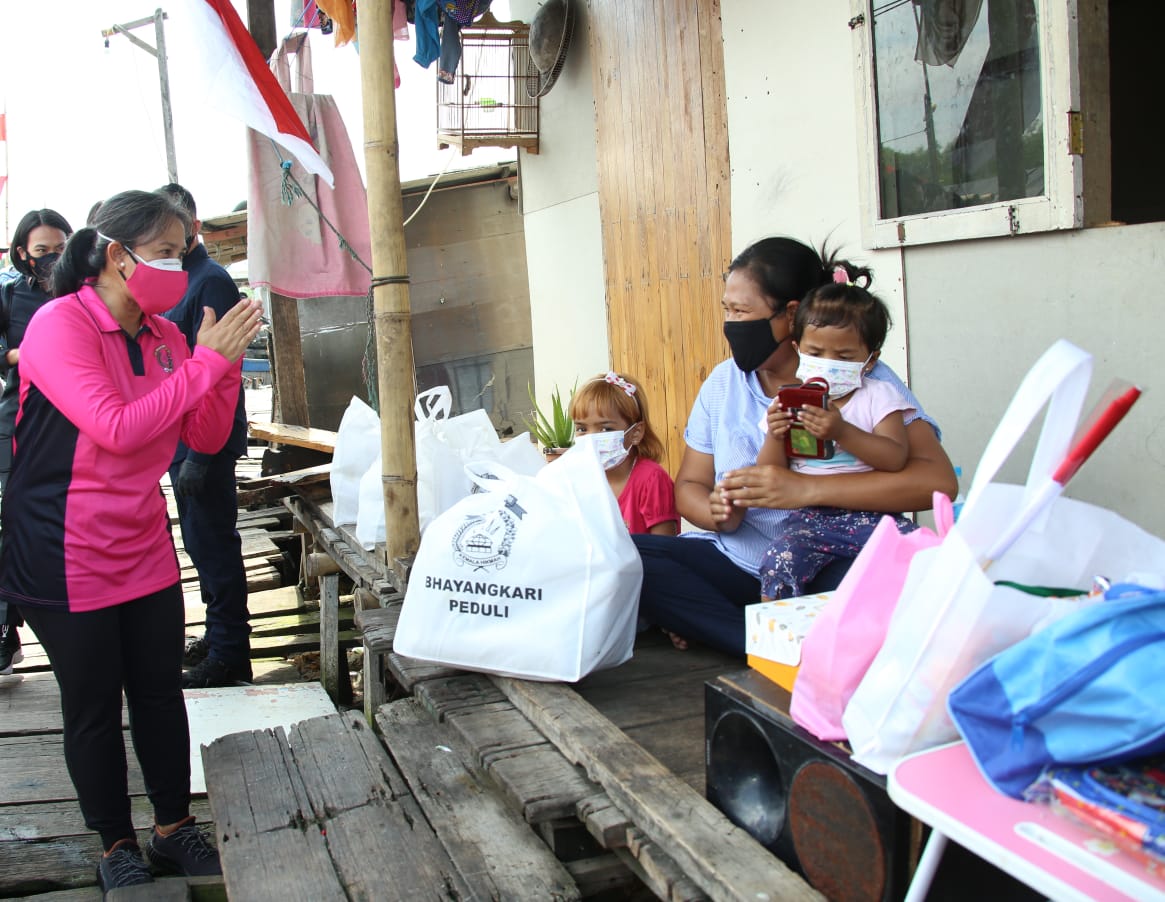REAKSIMEDIA.COM | Jakarta – Dalam rangka Hari Kesatuan Gerak Bhayangkari ke-69, Ketua Umum Bhayangkari Juliati Sigit Prabowo blusukan untuk memberikan bantuan sosial (bansos) bagi para nelayan yang ada di Kampung Nelayan Muara Angke, Jakarta Utara.