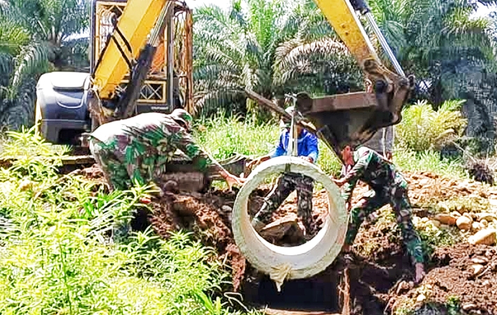 Setiap pergerakan excavator selalu diawasi langsung oleh anggota satgas di lapangan. Mereka memberikan arahan kepada operator agar gorong-gorong tidak miring atau terlepas dari pegangan.