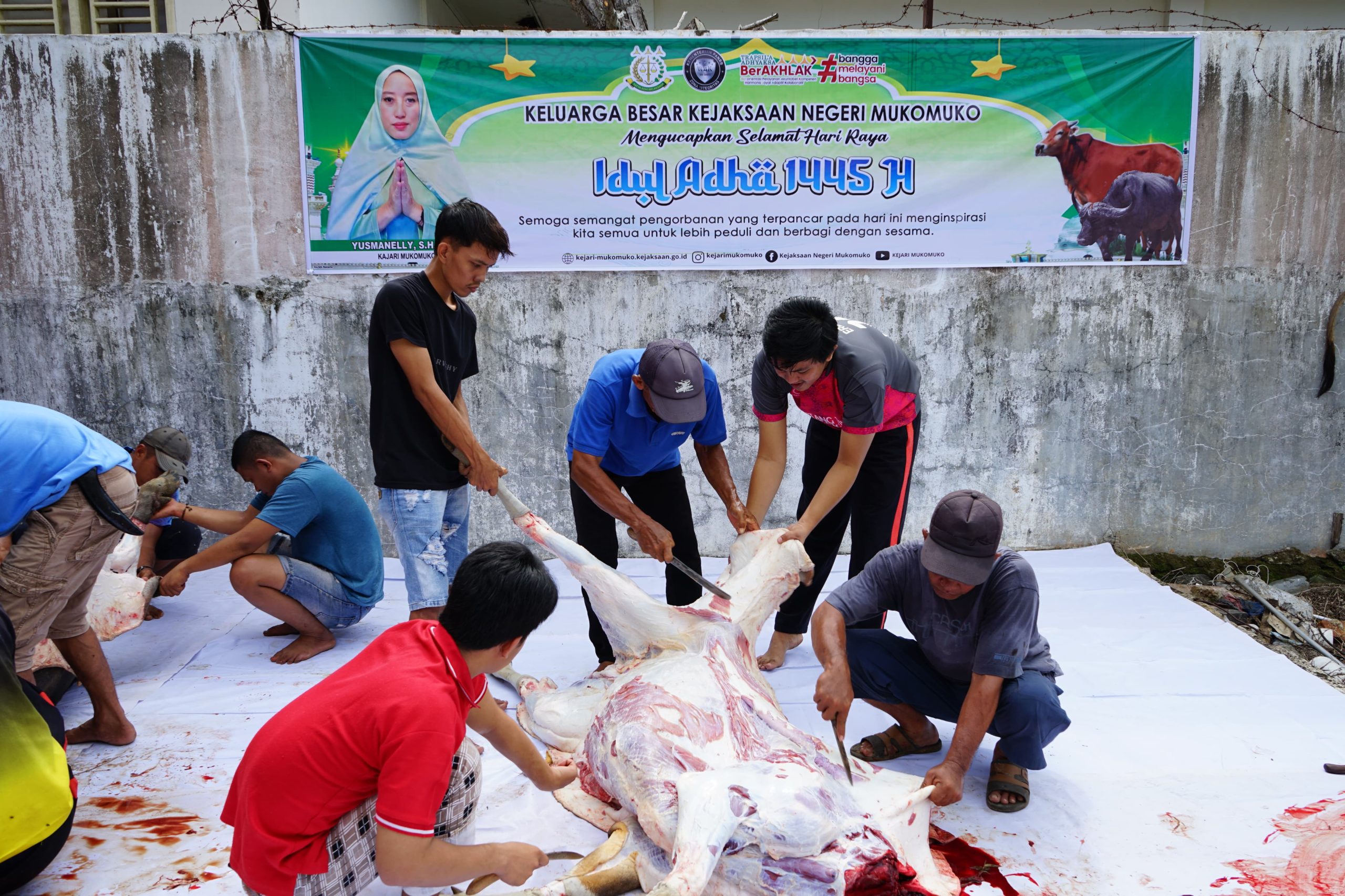 Kepala Kejaksaan Negeri Mukomuko Yusmanelly SH MH melalui Kasi Intelijen Kejari Mukomuko Radiman SH menyebutkan bahwa penyembelihan hewan Qurban dalam rangka Hari Raya Idul Adha 1445 Hijriah.