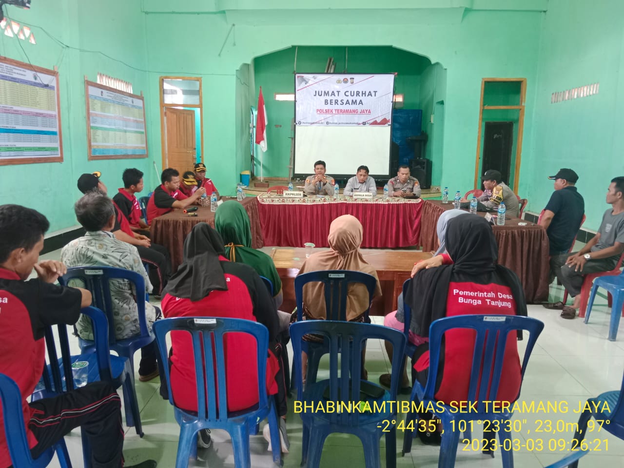 REAKSIMEDIA.COM | Mukomuko – Kapolsek Teramang Jaya yang didampingi Kanit Patroli dan Bhabinkamtibmas Polsek Teramang Jaya melaksanakan Kegiatan Jum’at Curhat Bersama dengan Pemdes dan warga Desa Bunga Tanjung di Aula Kantor Desa Bunga Tanjung Kecamatan Teramang Jaya Kabupaten Mukomuko, Jumat (3/3/23).