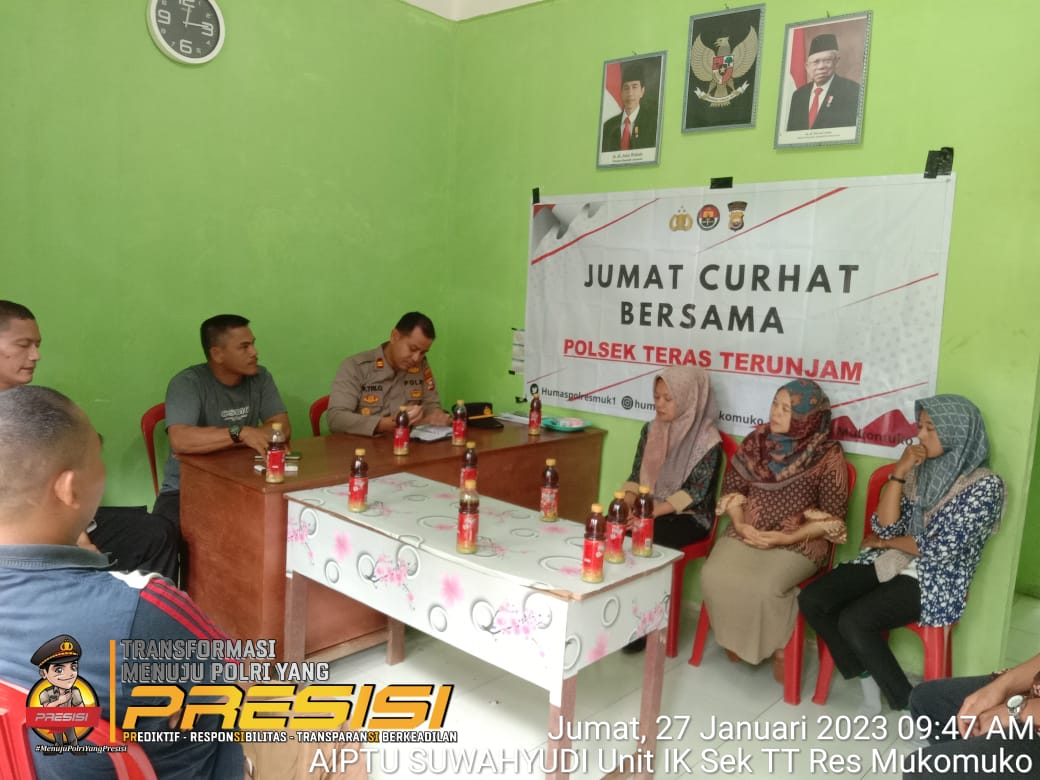 REAKSIMEDIA.COM | Mukomuko – Polsek Teras Terunjam Polres Mukomuko Polda Bengkulu melaksanakan Jumat Curhat dengan warga dan Pemerintah Desa Talang Kuning Kecamatan Teras Terunjam Kabupaten Mukomuko, Jumat (27/1/23).