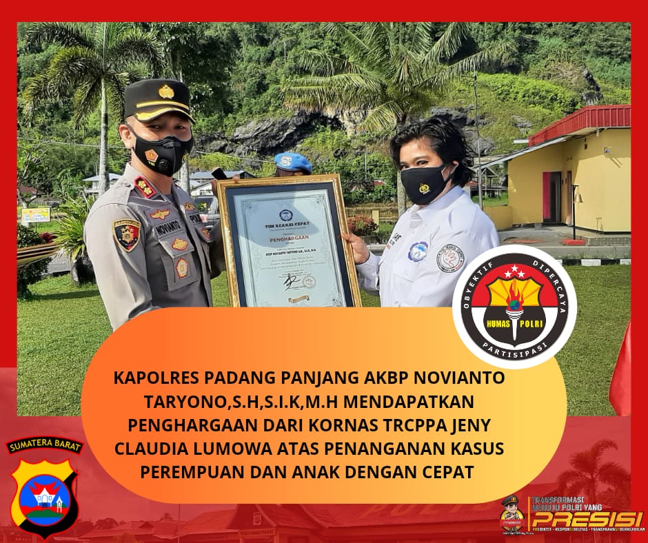 Penyerahan piagam tersebut di serahkan langsung Oleh Kornas TRCCPPA Jeny Claudia Lumowa yang di dampingi Kapolres Padang Panjang AKBP Novianto Taryono,S.H, S.I.K,M.H. pada saat Apel di Mapolres Padang Panjang pada hari Rabu (13/10/2021), yang mana saat apel berlangsung Kornas TRCPPA yg akrab di sapa “Bunda Naomi” Ini menjelaskan bahwa kami (TRCPPA) tidak akan main main dalam perkara yg melibatkan perempuan dan anak, dan kami akan selalu melakukan pemantauan atas perkembangam kasus kekerasan terhadap anak dan perempuan yang terjadi di seluruh Indonesia serta bagaimana kecepat tanggapan sebuah Polres dalam menangani dan melakukan penyidikan perkara tersebut. dan Kami juga akan memberikan Reword (penghargaan) Kepada Polres yg cepat tanggap dalam melakukan penyidikan atas kasus yang menyangkut perlindungan perempuan dan anak.