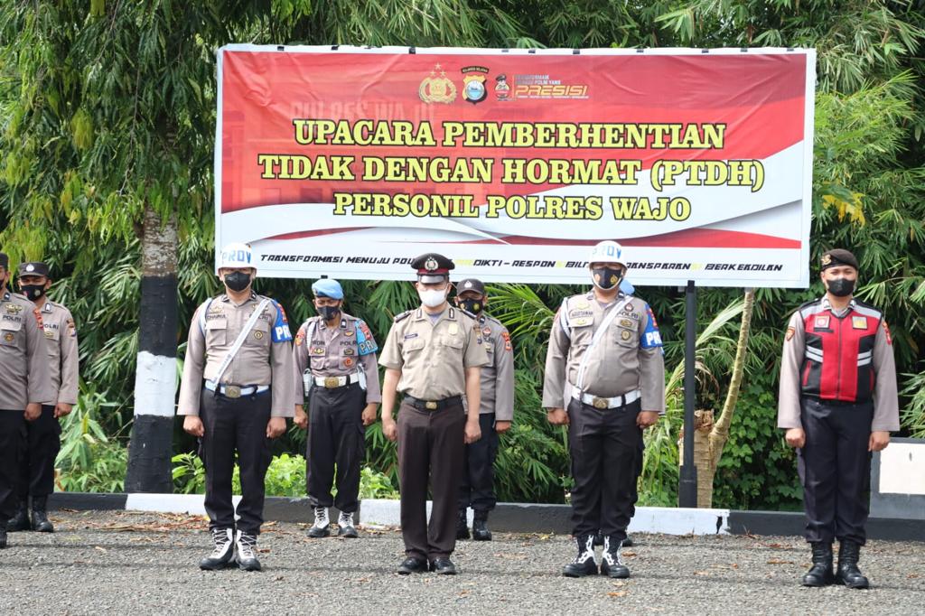 Pada upacara tersebut Personil yang di PTDH hadir dengan dikawal oleh personil Provos Polres Wajo dan dilakukan penanggalangan Pakaian dinas Polri oleh Kapolres Wajo.