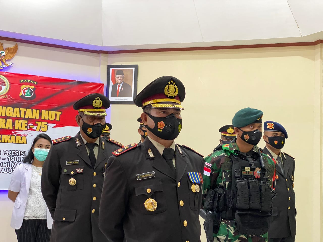 REAKSIMEDIA.COM | Karubaga – Bertempat di Aula Mapolres Tolikara, Kapolres Tolikara AKBP Dr. Y. Takamully, S.H., M.H besama instansi terkait mengikuti upacara virtual Hari Bhayangkara ke-75 yang dipimpin langsung Presiden RI Ir. H. Joko Widodo sebagai inspektur upacara di Istana Negara Jakarta, Kamis (1/7).