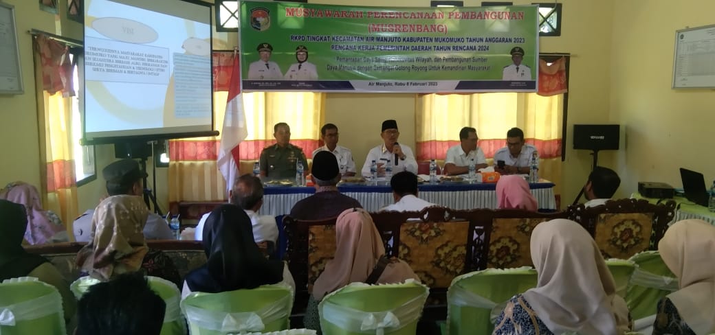 REAKSIMEDIA.COM | Mukomuko – Pemerintah Kecamatan Air Manjuto menggelar kegiatan Musyarawah Rencana Pembangunan Kecamatan (Musrenbangcam) tahun 2024 di Aula Kantor Camat Air Manjuto Kabupaten Mukomuko, Rabu (8/2/23).