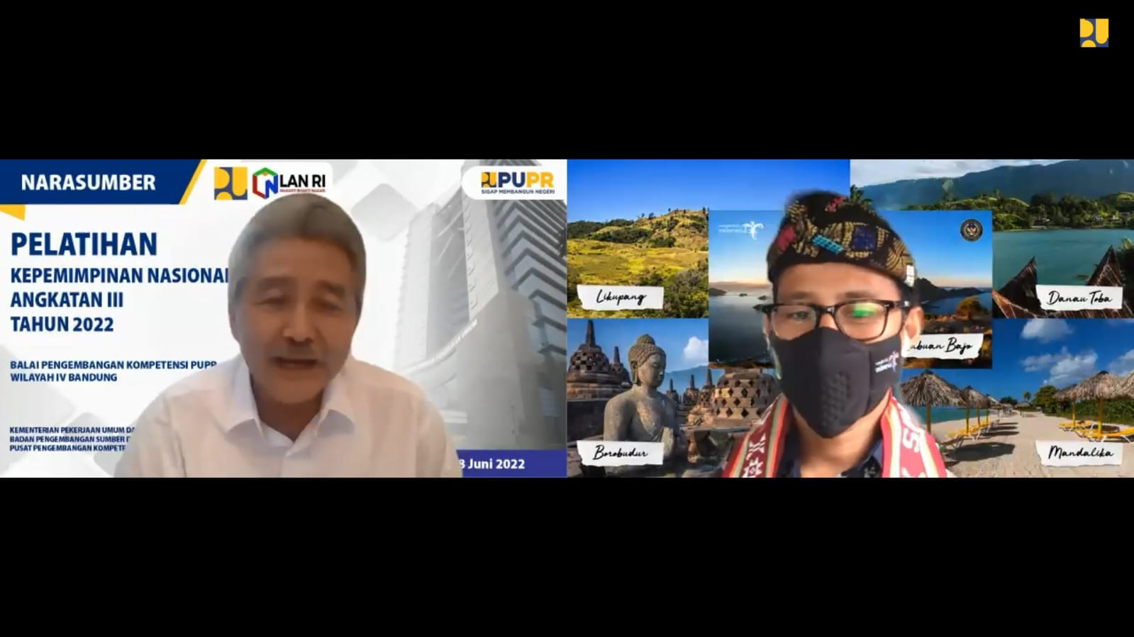 Pelatihan ini diikuti oleh 40 peserta yang berasal dari Kementerian PUPR, Pemerintah Daerah, Kepolisian, Kementerian Agraria dan Tata Ruang (ATR)/Badan Pertanahan Nasional (BPN), dan Kementerian Komunikasi dan Informatika. Turut hadir sebagai narasumber pada pelatihan hari ini yaitu Menteri Pariwisata dan Ekonomi Kreatif (Menparekraf) Sandiaga Salahuddin Uno.
