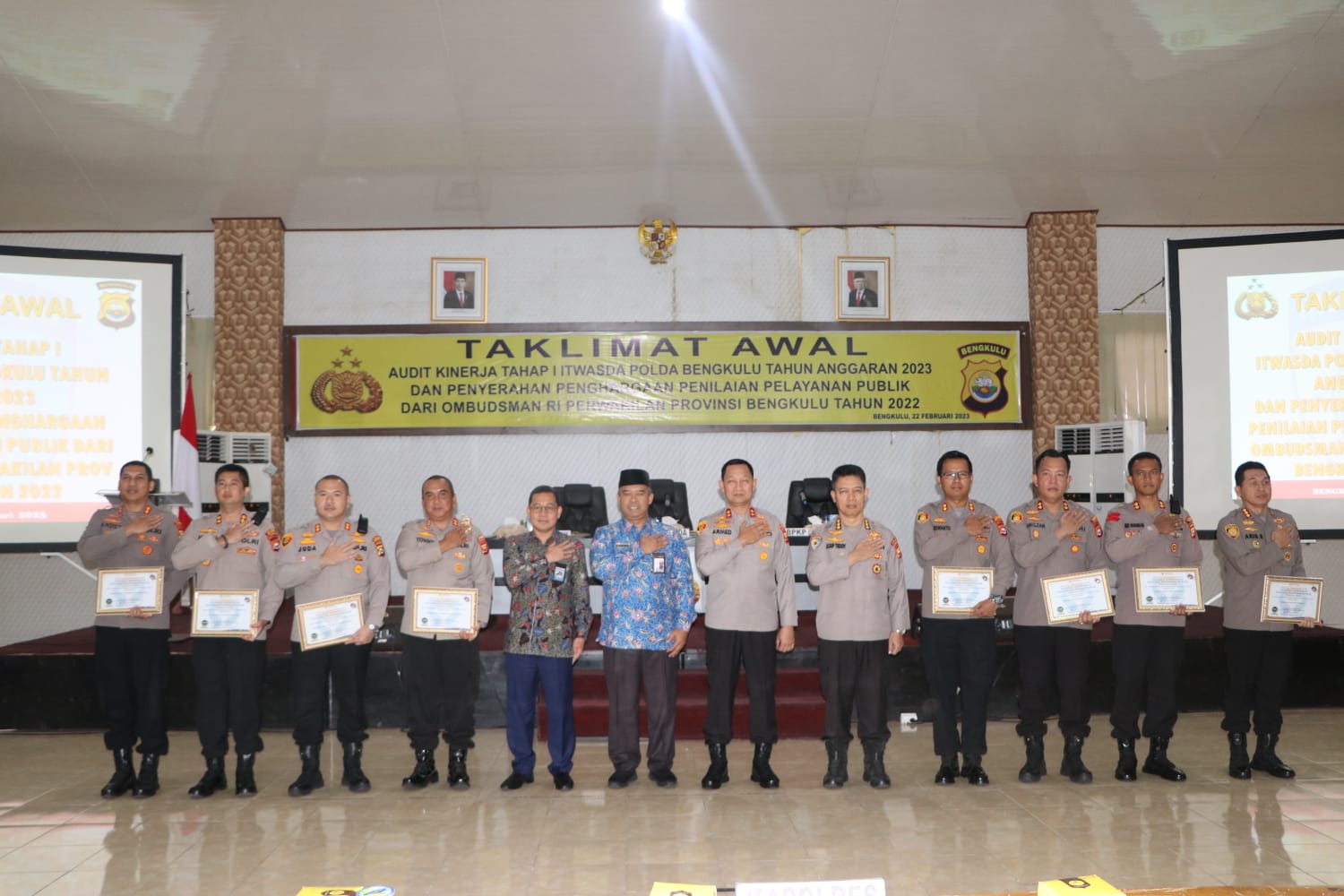 REAKSIMEDIA.COM | Mukomuko – Kapolres Mukomuko menghadiri taklimat awal Audit Kinerja Itwasda Polda Bengkulu Tahap I T.A 2023 dan penyerahan penghargaan dari Ombudsman RI perwakilan Provinsi Bengkulu. Rabu (22/2/23).