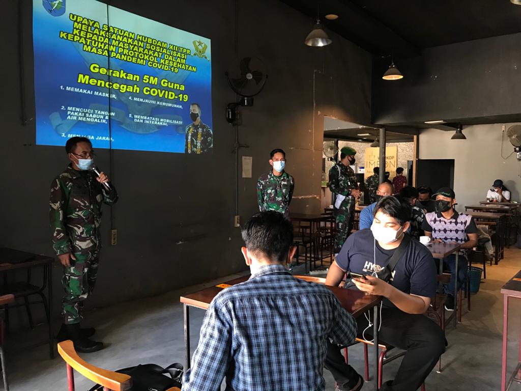 “Dalam rangka memberikan rasa aman dan nyaman bagi masyarakat Bansir Laut, Hubdam XII/Tpr melakukan sosialisasi tentang penerapan disiplin dan penegakan hukum protokol kesehatan,” kata Kasituud, Mayor Chb Ach. Dadang.