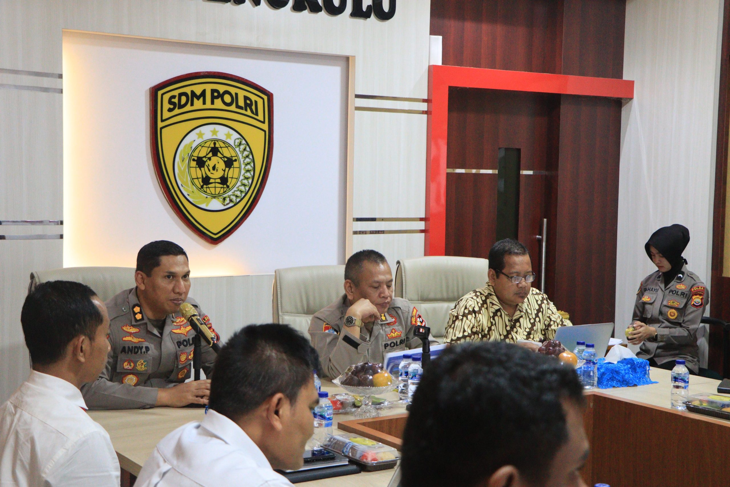 Tim Supervisi dan Penelitian Puslitbang Polri. Kunjungan tim puslitbang Polri yang dipimpin oleh Analis Utama Puslitbang Polri Kombes Pol. Ade Djadja Subagdja, S.I.K.,M.H., dalam rangka penelitian tentang strategi pengembangan SDM Polisi Siber (Cyber Police) di satuan kewilayahan dalam rangka mewujudkan Polri 4.0 di Polda Bengkulu.