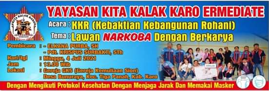 Yayasan Kita Kalak Karo Ermediate akan menggelar Kebaktian Rohani (KKR) besok, Minggu (04/07/2021) mulai pukul 13.00 Wib di Gereja Kemulian Sion (GKS) Desa Bunuraya Kecamatan Tigapanah Kabupaten Karo Sumatera Utara.