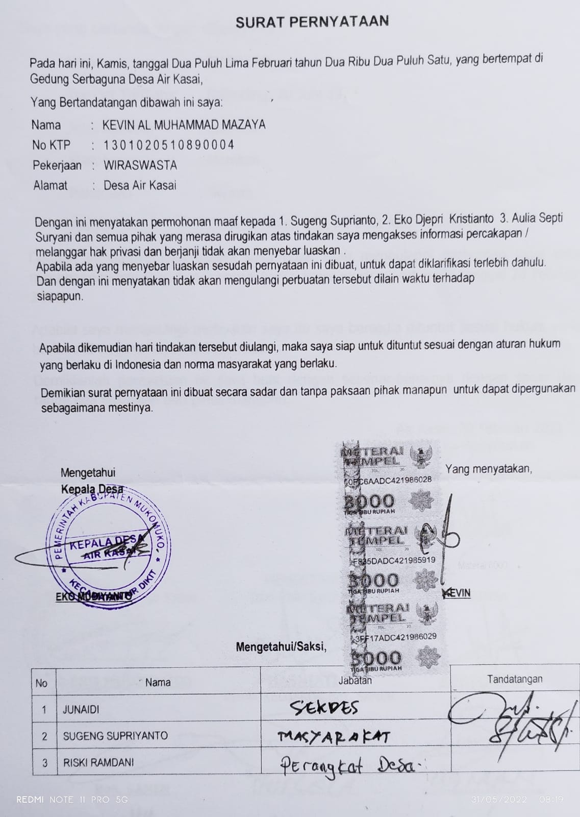 Sedangkan pelapor, Kevin Al Muhammad Mazaya, mengapresiasikan kinerja Kejari Mukomuko dalam menangani laporan dugaan penyelewengan dana desa Air Kasai. Dengan ini menyerahkan sepenuhnya permasalahan ini pada pihak yang berwenang, karena ia menyakini pihak Kejari mampu menuntaskan terkait laporan yang disampaikan.