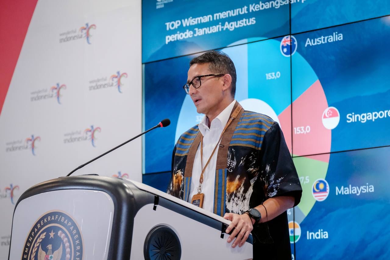 Menparekraf Sandiaga saat “Weekly Brief With Sandi Uno” di Gedung Sapta Pesona, Jakarta, Senin (17/10/2022) menyampaikan pemerintah masih memiliki 3 bulan agar bisa mencapai ambang batas tengah dan atas dari target kunjungan wisatawan mancanegara 1,8 juta sampai 3,6 juta.