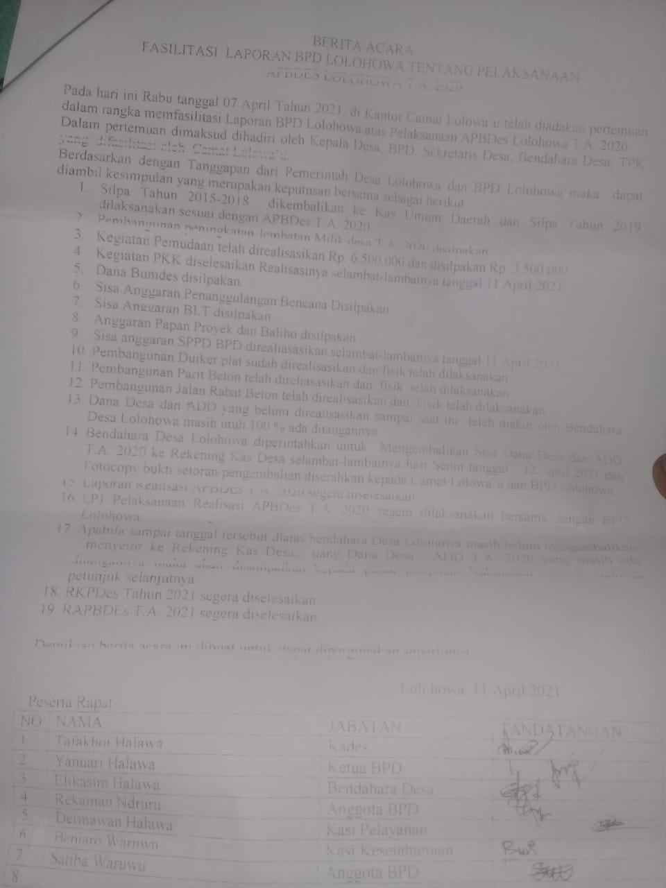 Ketika surat dari Inspektorat Nias Selatan Ke Camat lolowau, akhirnya Camat Lolowa, mengundang Aparat Desa Lolohowa, serta BPD pada tanggal 07 April 2021.