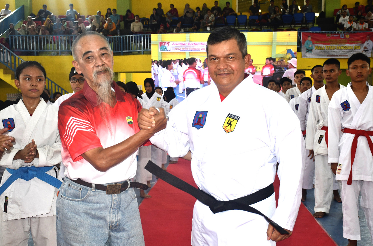 Di waktu dan tempat yang sama, Sensei Karate Dan V, H. Achmad Deni SE, SPd, MSi, MH juga memberikan baju kebesaran lengkap dan menyematkan Dan III Hitam Kehormatan kepada Pangdam I/BB Mayjen TNI Achmad Daniel Chardin.