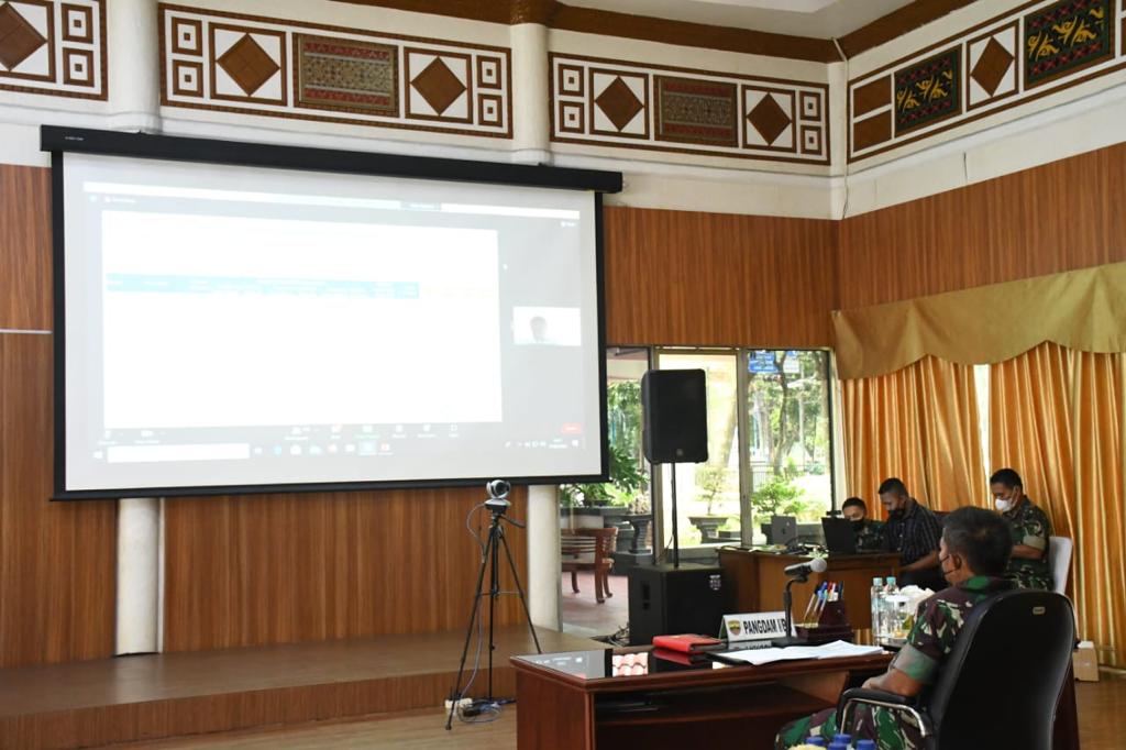 REAKSIMEDIA.COM | Medan – Panglima Kodam I/BB, Mayjen TNI Hassanudin, SIP, MM, didampingi Kakesdam I/BB dan sejumlah Asisten Kasdam I/BB mengikuti rapat koordinasi penanganan kasus Covid-19 dan evaluasi PPKM secara video conference dengan Menko Perekonomian, Airlanga Hartarto dari rumah dinas kediaman Pangdam I/BB di Medan, Minggu (13/2/2022).