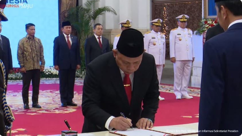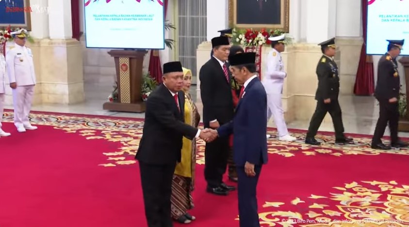 Pelantikan Laksdya TNI Irvansyah oleh Presiden RI Joko Widodo berdasarkan Petikan Keputusan Presiden Republik Indonesia Nomor 118/TPA Tahun 2023 tentang Pemberhentian dan Pengangkatan dari dan Dalam Jabatan Pimpinan Tinggi Utama di Lingkungan Badan Keamanan Laut.