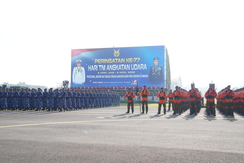 Sebanyak 89 pesawat berbagai jenis dan 3.693 personel TNI AU dilibatkan dalam peringatan HUT Ke-77 TNI AU yang digelar di Lanud Halim Perdanakusuma, Jakarta. Acara pokok berupa parade dan defile serta acara tambahan demo udara dan darat. Demo udara berupa penampilan pesawat-pesawat TNI AU, sementata demo darat berupa simulasi Pembebasan Sandra (Basra) oleh pasukan Kopasgat. Puluhan senjata Pasgat berbagai tipe, juga ikut dalam defile.