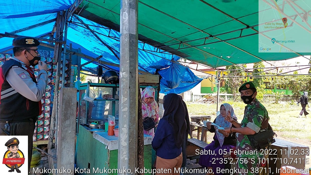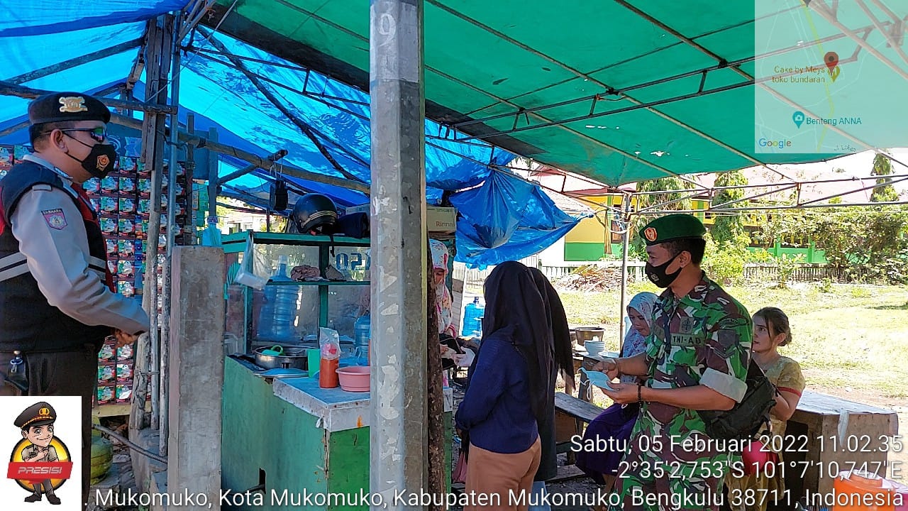 Anggota Patroli Sat Samapta Polres dan Prajurit dari Kodim 0428 MM melaksanakan Patroli bersama untuk penegakan Protokol Kesehatan dalam rangka KRYD di bundaran Mukomuko, Kecamatan Kota Mukomuko, Kabupaten Mukomuko. Sabtu (5/2/22).