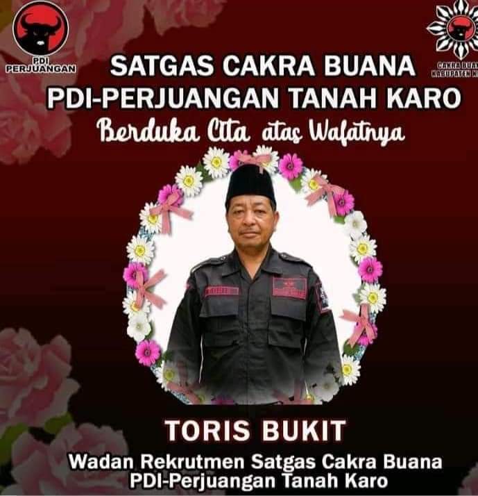 ” Satgas cakra buana PDI Perjuangan Kabupaten Karo berduka, atas berpulangnya saudara/sahabat kami “Toris Bukit, selamat jalan saudaraku dan sampailah ke Rumah BAPA di Surga, dan harapan kami keluarga yang ditinggalkan sabar dan tabah menghadapi ini semua “kata Sejarah Pandia, Pengurus Satgas PDI Perjuangan Kabupaten Karo.