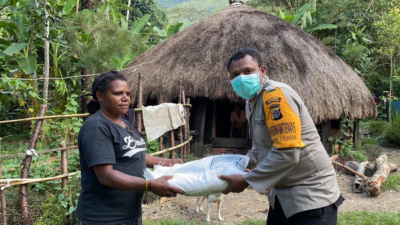 Dalam kunjungannya, Kapolres Tolikara turut menyerahkan bantuan sembako dengan bahan bangunan triplekx, seng dan kayu balok untuk membantu pembangunan rumah salah seorang masyarakat kelompok tani Desa Bandia.